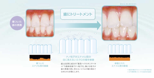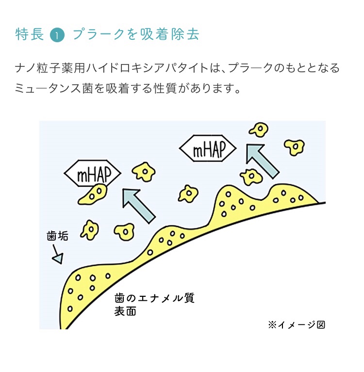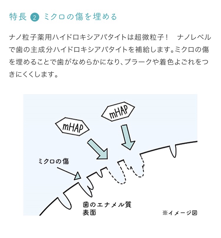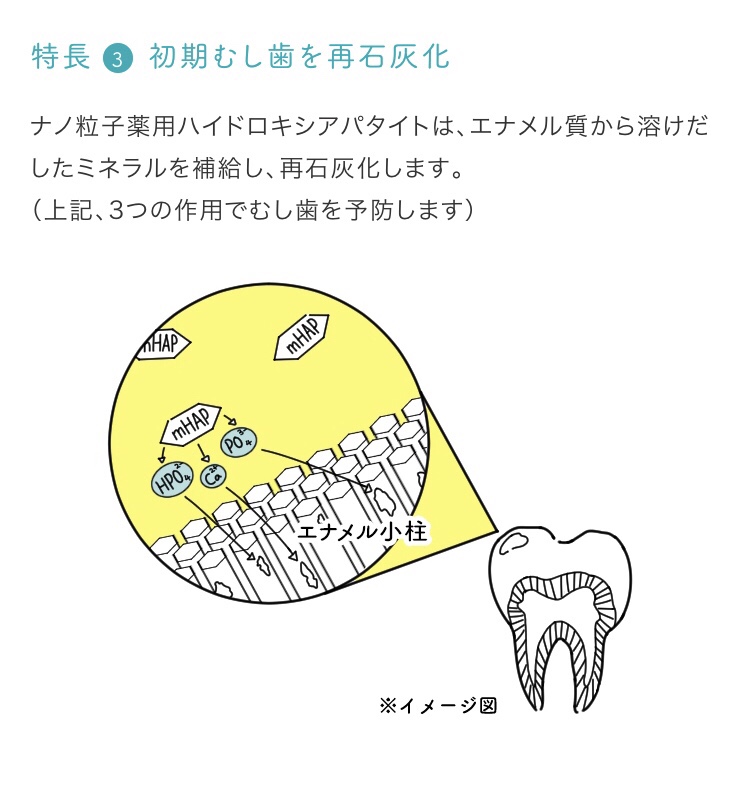 アパガードリナメルは【ナノ粒子ハイドロキシアパタイト】が配合されていて、傷ついた歯の表面を修復し、ミネラルを補給。 プラーク(歯垢)やステイン(着色)をつきにくくし、虫歯を予防します。