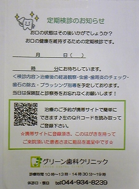 ただ今、キャンペーン中です!粗品プレゼント♪このはがきがお手元に届いた患者さま☆ぜひWEB予約を携帯電話にご登録を♪