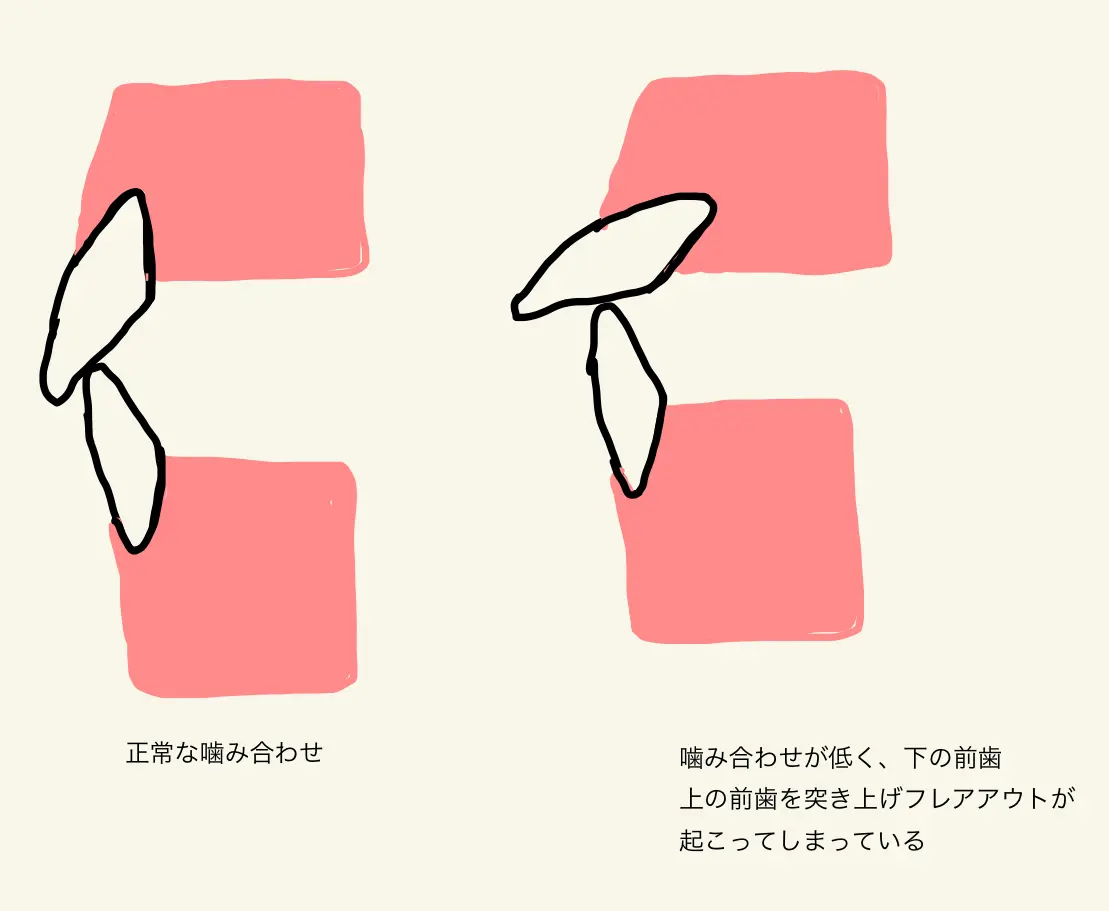 ◆なぜ噛み合わせが低いと前歯がフレアアウトするの?