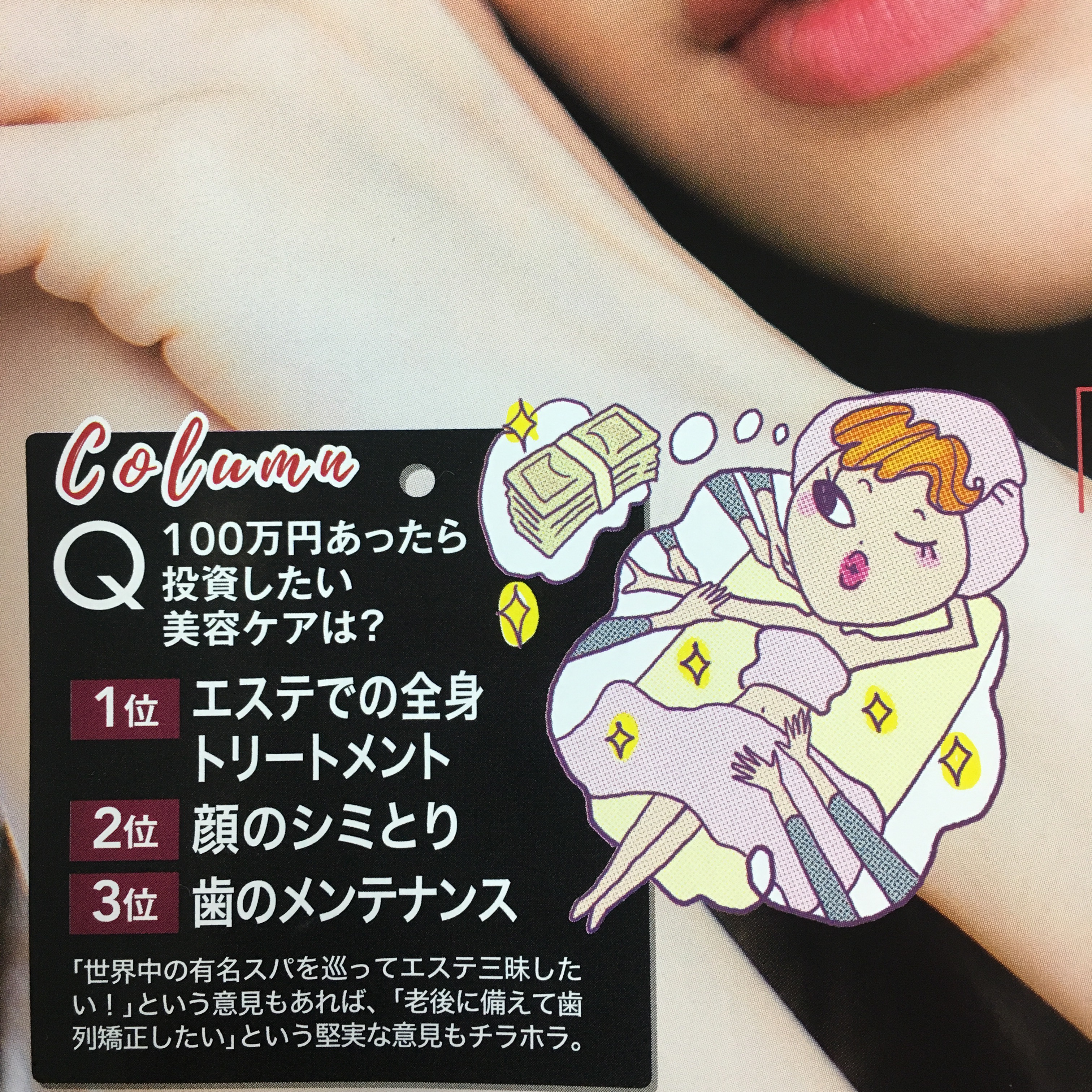 2016年12月31日 Kawabata 雑誌の記事 年末の慌しい時期なので、歯に関しての気軽な話題を。 とある雑誌の1ページに 「投資したい美容ケアは?」 というコラムがありました。 歯科医としては、オドロキの3位 「歯のメインテナンス」 みなさん、歯に対して関心を持ってくださってるんだな、と思い、思わずほっこりしてしまいました。 定期検診も、大事なメインテナンスの一つです。 来年も、気軽に足をお運びくださいね。