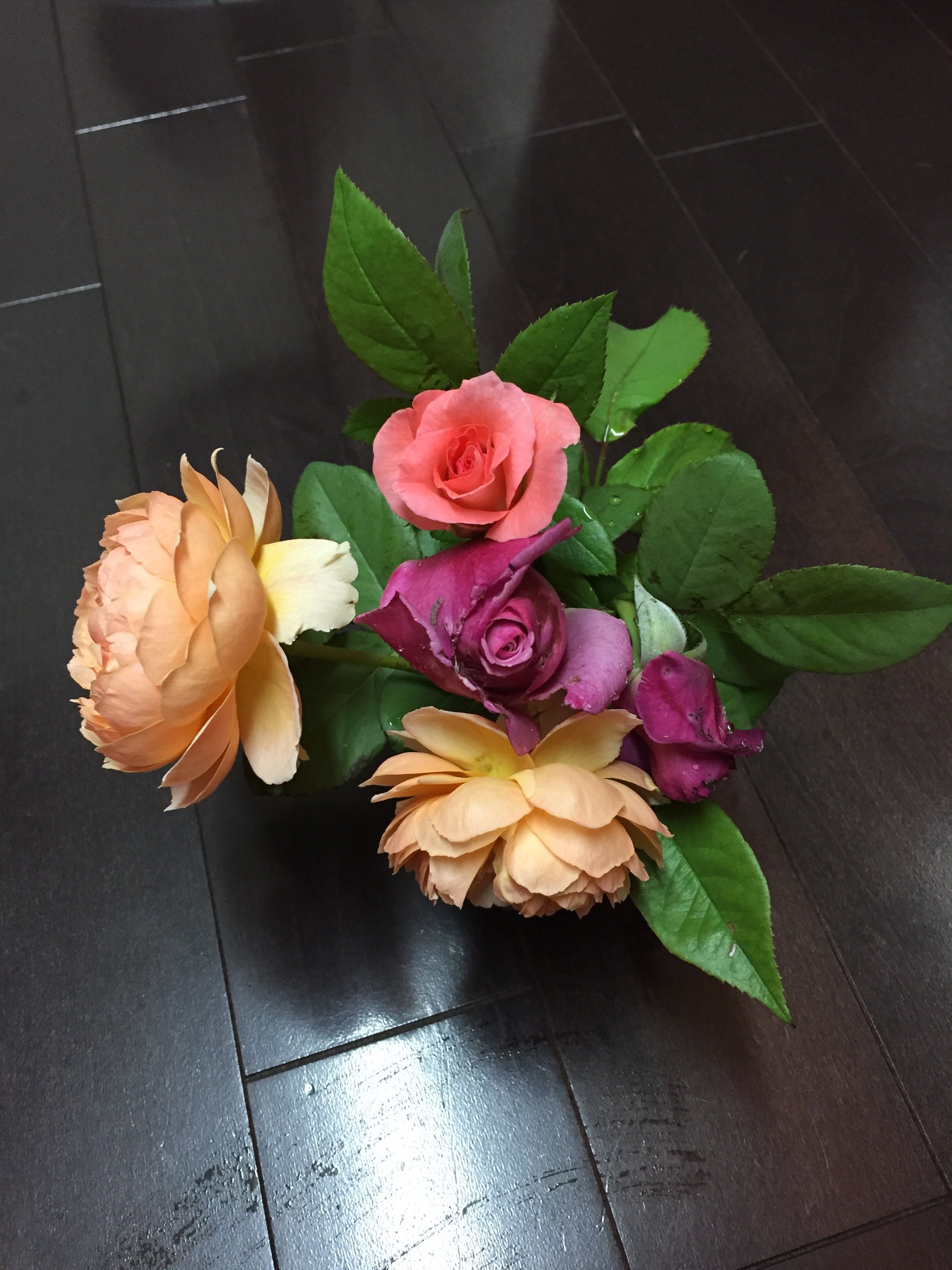 2017年07月19日 KD♪ □ 返り咲き 連休も部活の為早起き。 いつもだと咲ききってしまううえ、カナブンにモグモグされてしまう中央上のサーモンピンクのリバプールエコーが美しい状態で切り花にできました! 連日の暑さでせっかく咲いたジュードも花弁がシワシワになるので早めに切り花に。 お仏壇には派手なチームで。。。 良い香り(^o^)