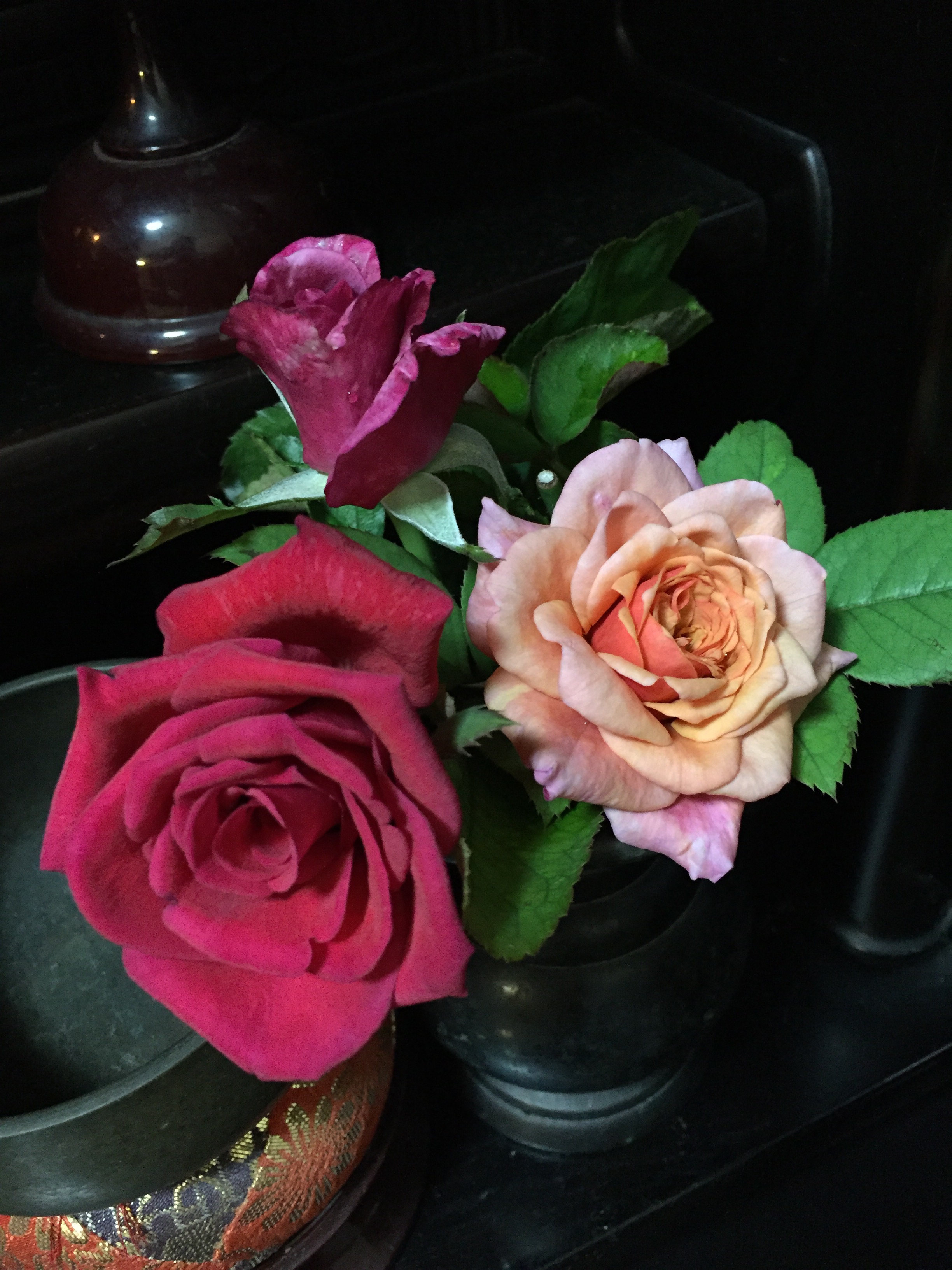 2017年08月26日 KD♪ □ お供え お仏壇がバラ祭り笑 すぐ咲いちゃうし売り物と違ってまっすぐ長い茎ではないから活けやすい笑 左下から反時計回りにカーディナルと雅とバーバラ。秋に向けて夏剪定なんですが、お手本のように葉っぱが毎年残らない我が家。 ザックリ半分の高さにしますなんてマボロシ〜。 来年のテーマも決まり、総合判断すると庭掃除を最初にやる事になるので残暑厳しくないと良いなぁ〜。ボチボチ動くとします。