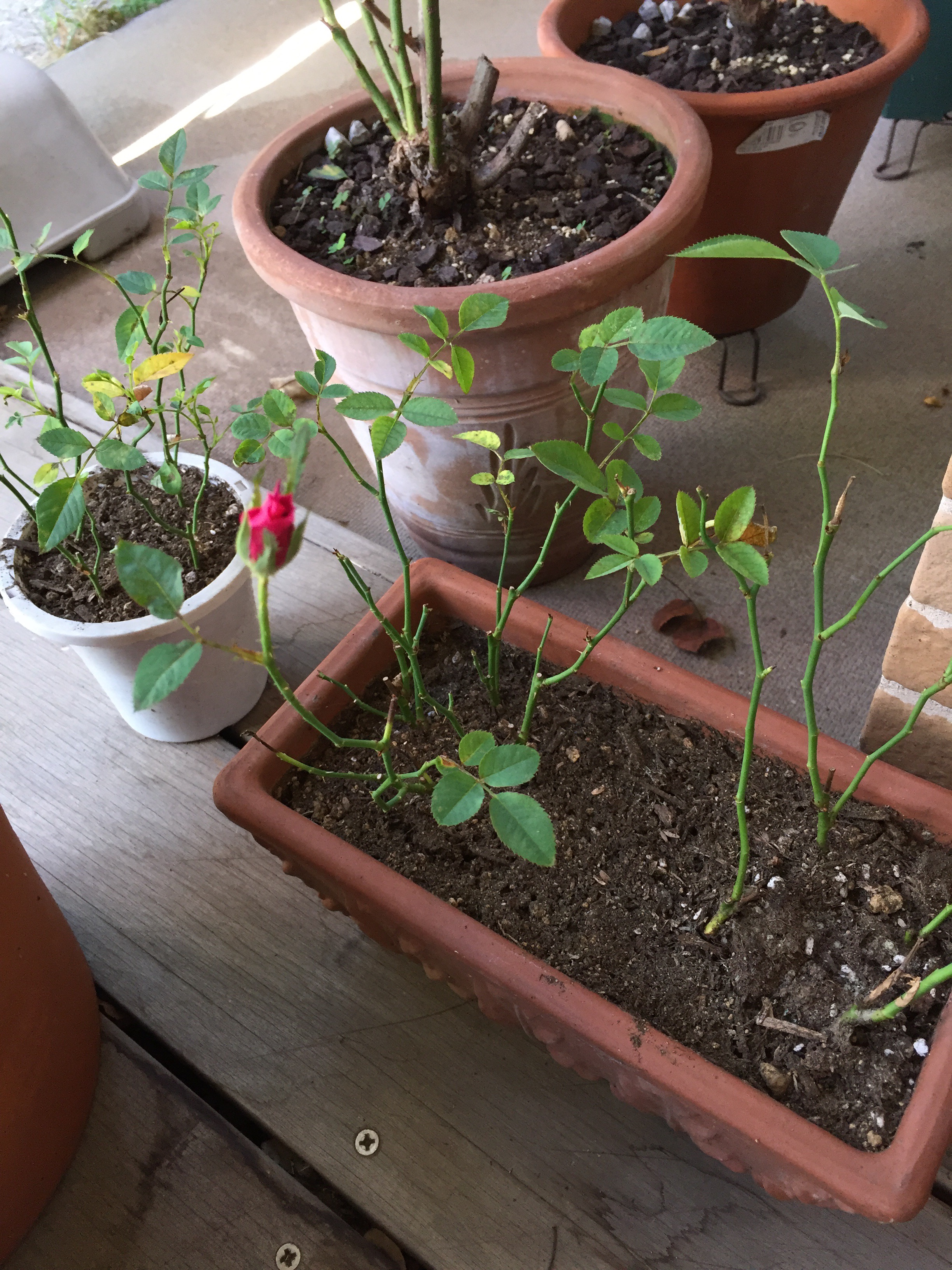 2017年09月02日 KD♪ □ 植え替え 長雨だったしでと言い訳から〜 前述のホムセンからお迎えしたミニバラを植え替えしました。植え替え移動の後は日陰で養生中。。。葉がスカスカ笑 花に養分を取られちゃ良くないのですが、早めに切れば良かろうとそのまま。 春先大移動したつるバラの状態がよろしくなく、再検討。主人に手伝ってもらいながら来年こそはと作戦計画中。。。