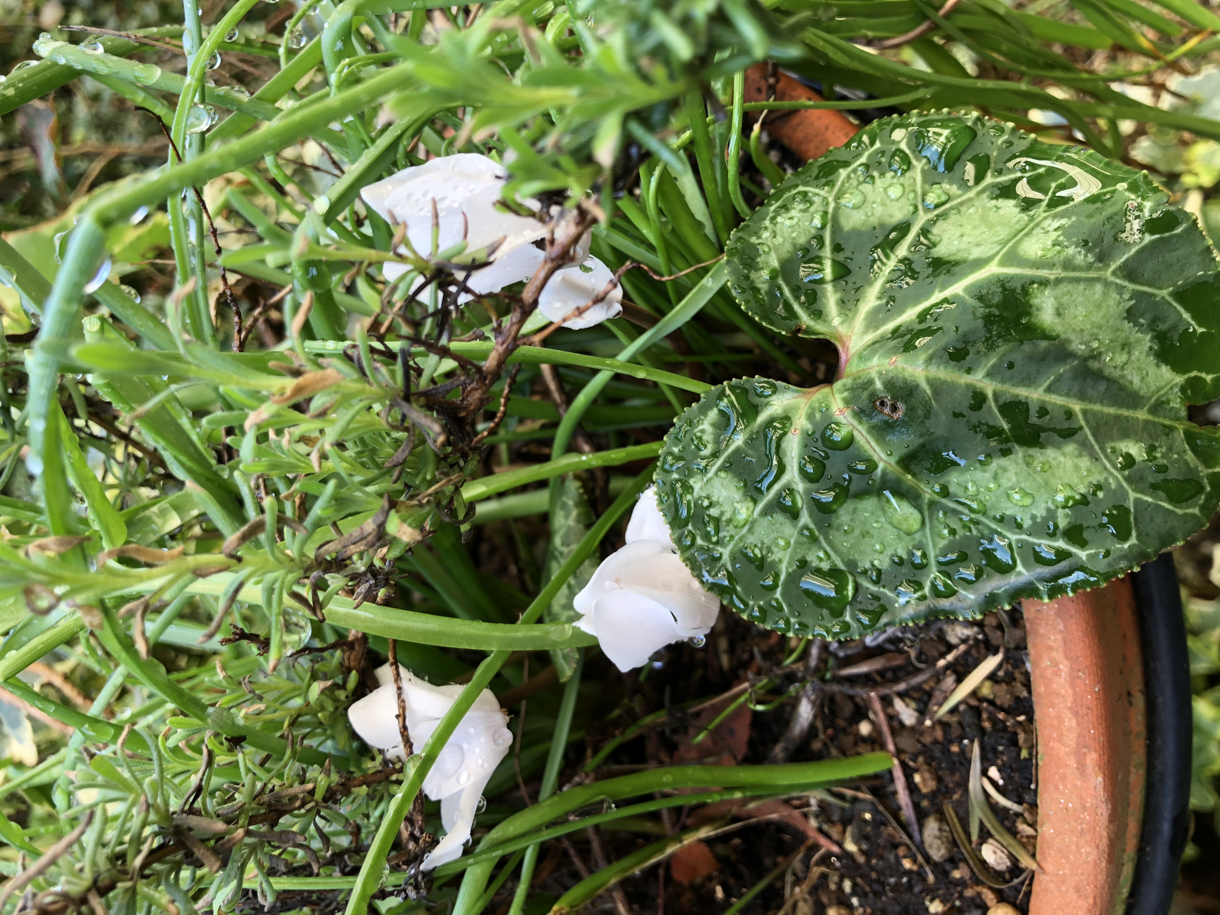 気持ちが伝わったのか早々に白色ミニシクラメンが咲いてました。