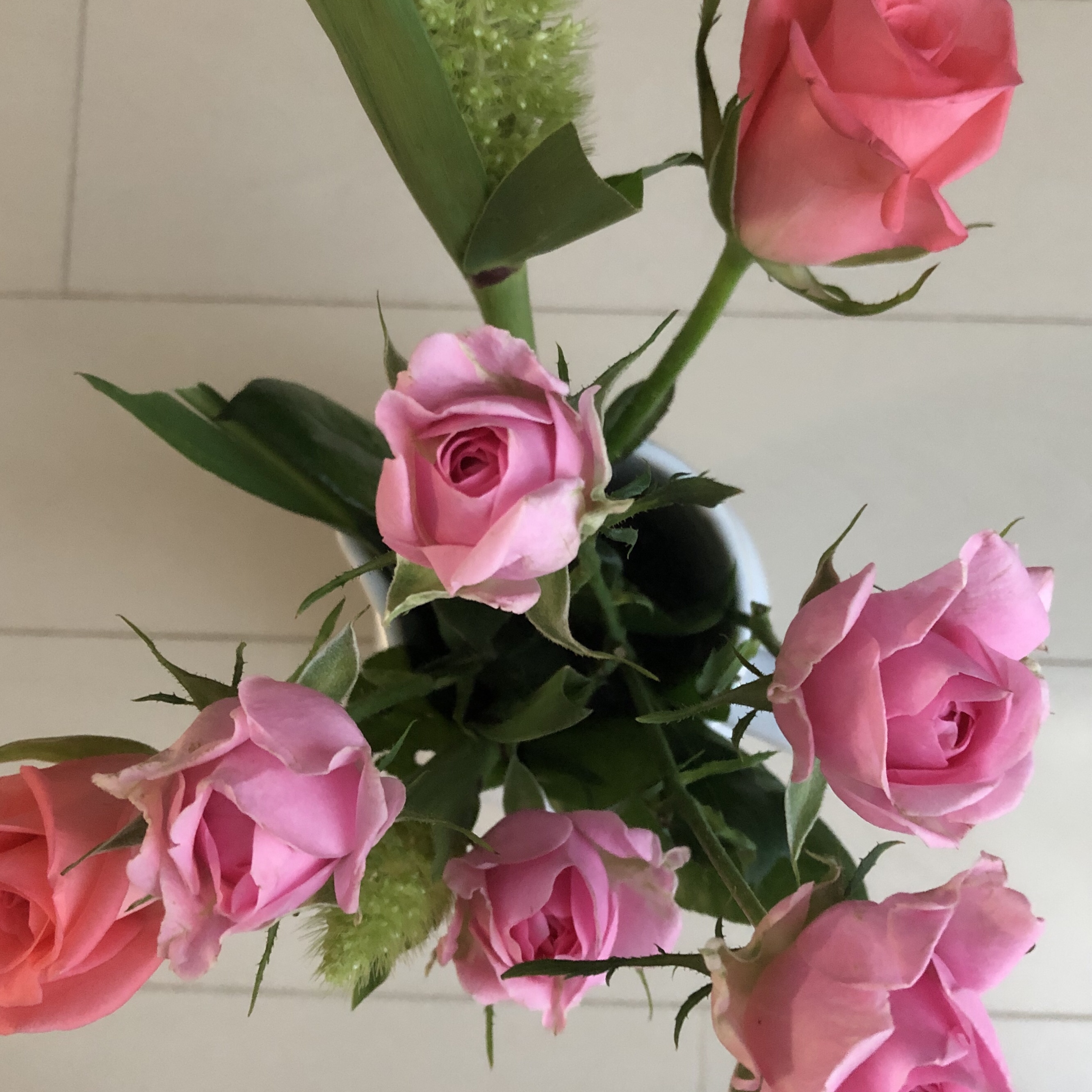 2019年06月20日 a□薔薇 いつものお花屋さんで、この日は薔薇を買いました。 トーンの違うピンクを混ぜてみました。 今回は麦の穂のようなグリーンをおまけにつけて下さいました。 いつもありがとうございます。