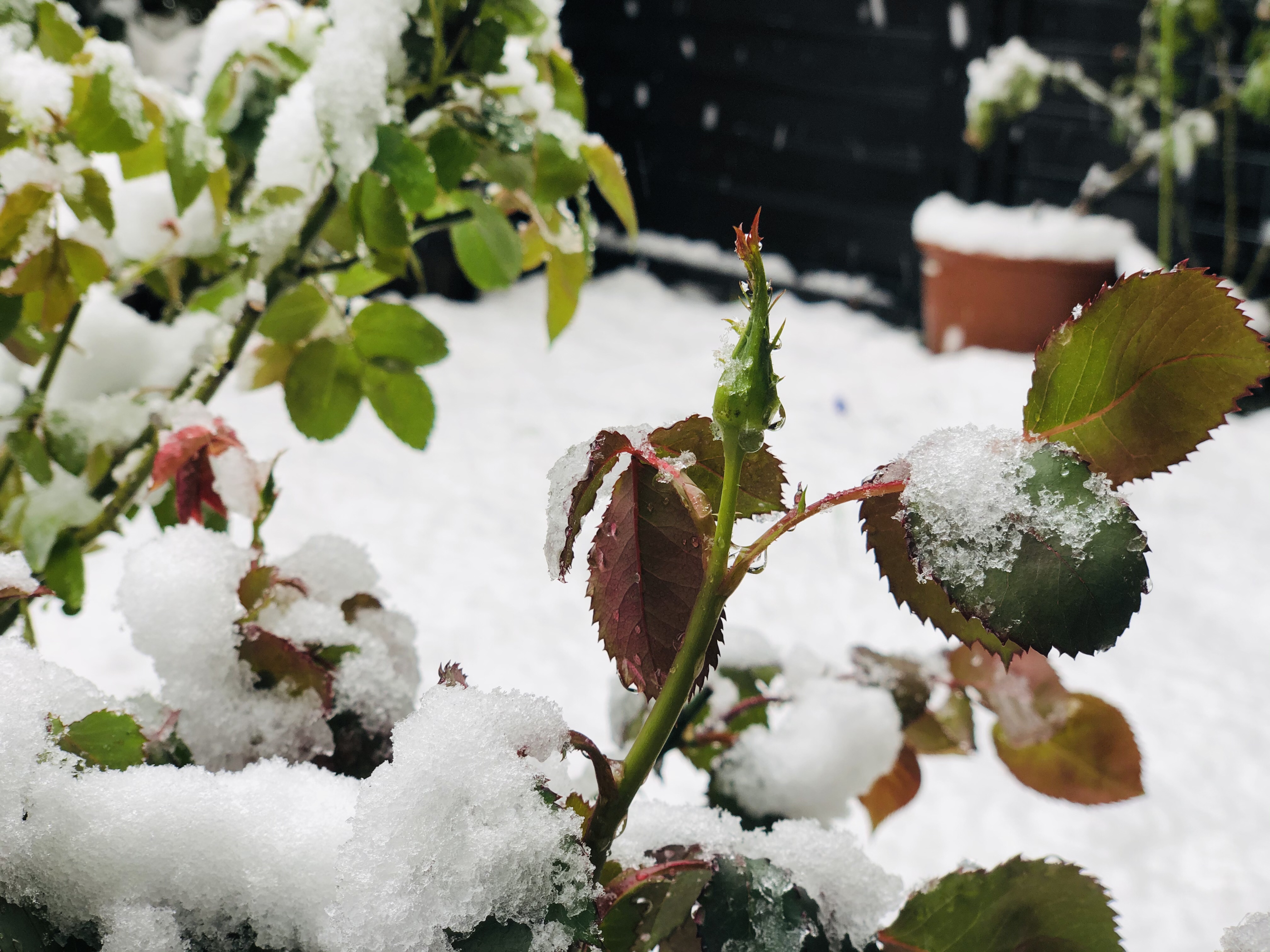今年も元気そうなカーディナル。もうツボミも良い感じになってきましたが、雪。なかなかない画像です。
