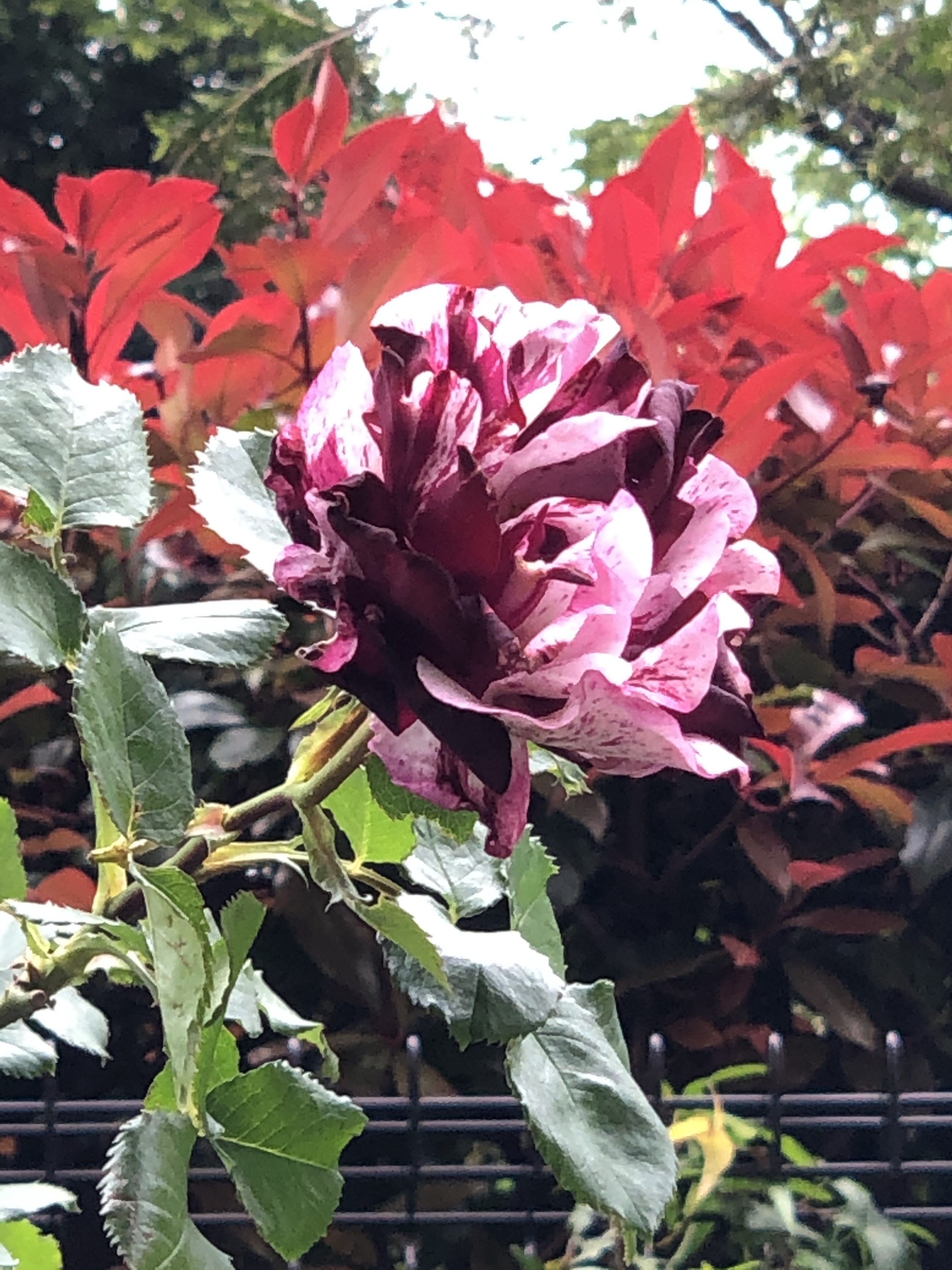 自撮り棒がないので遠隔から撮影。絞りのつるバラが咲きました!