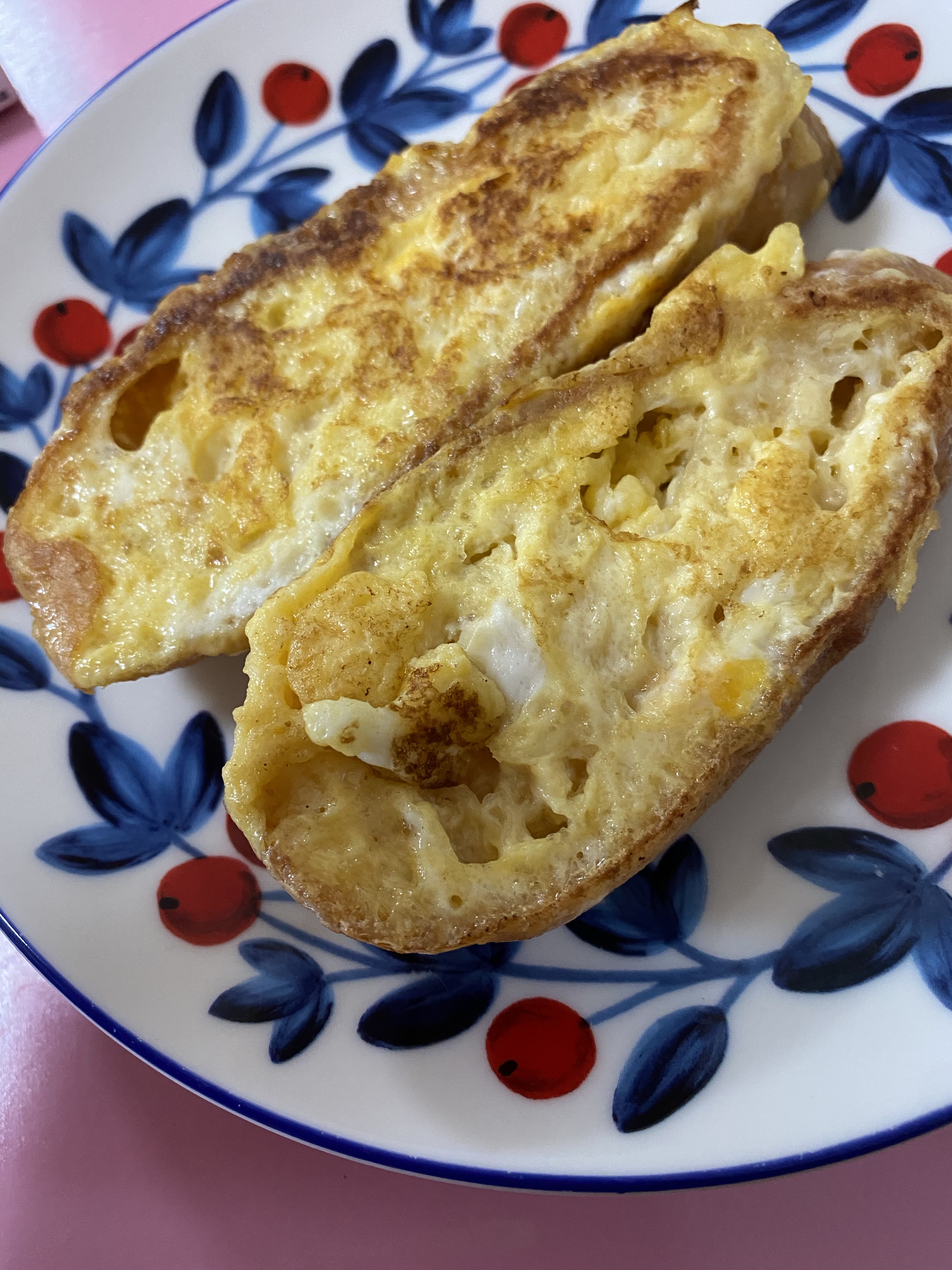2020年05月25日 p □ フレンチトースト バケットが安かったので朝ご飯にフレンチトースト。 牛乳と砂糖を使わずに、豆乳とキシリトール で作っているからだいぶヘルシーに仕上がりました。安いしヘルシー、そして簡単。