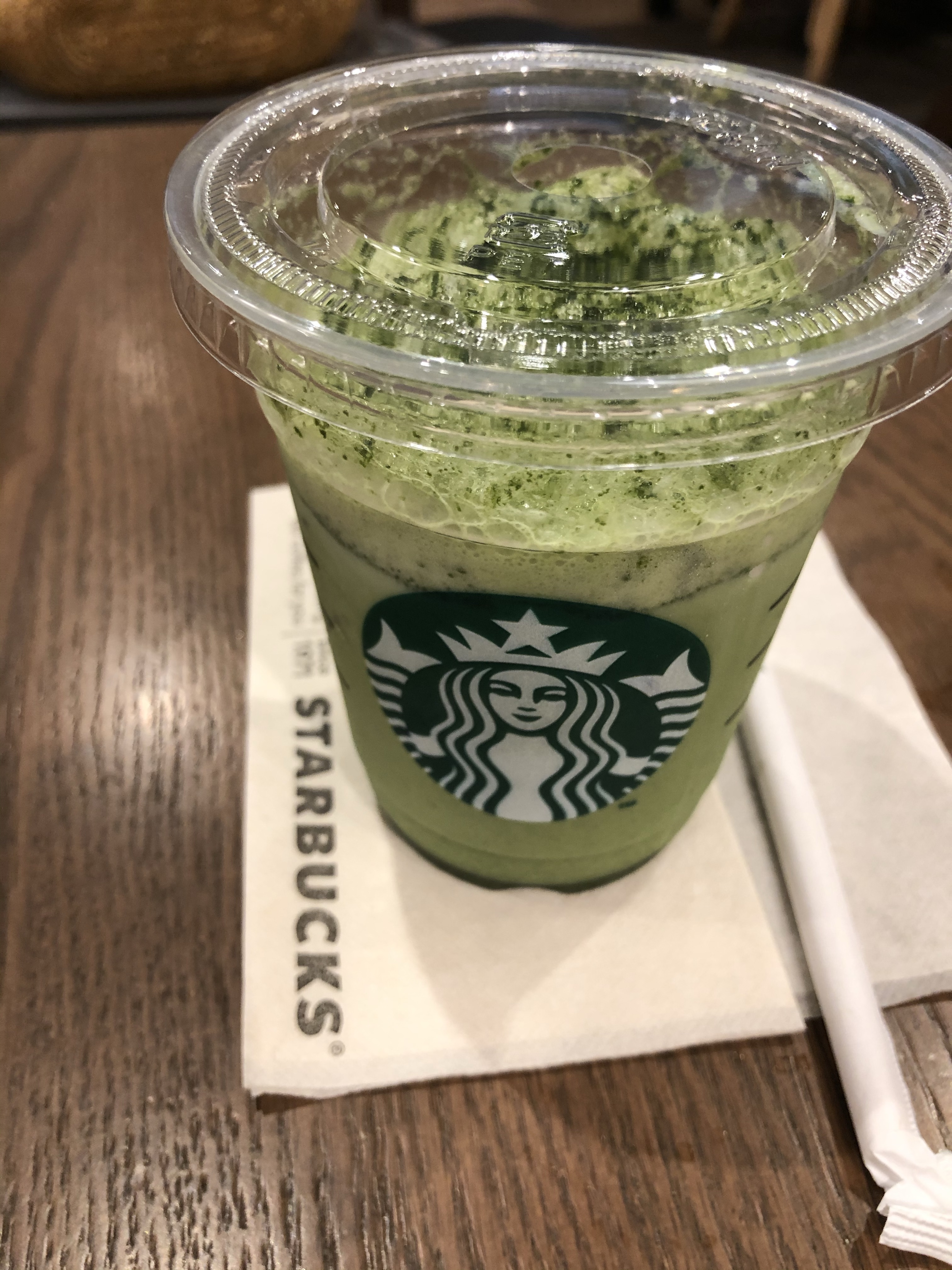 子供と待ち合わせに、珍しくコーヒーではなく、抹茶ティーラテ。