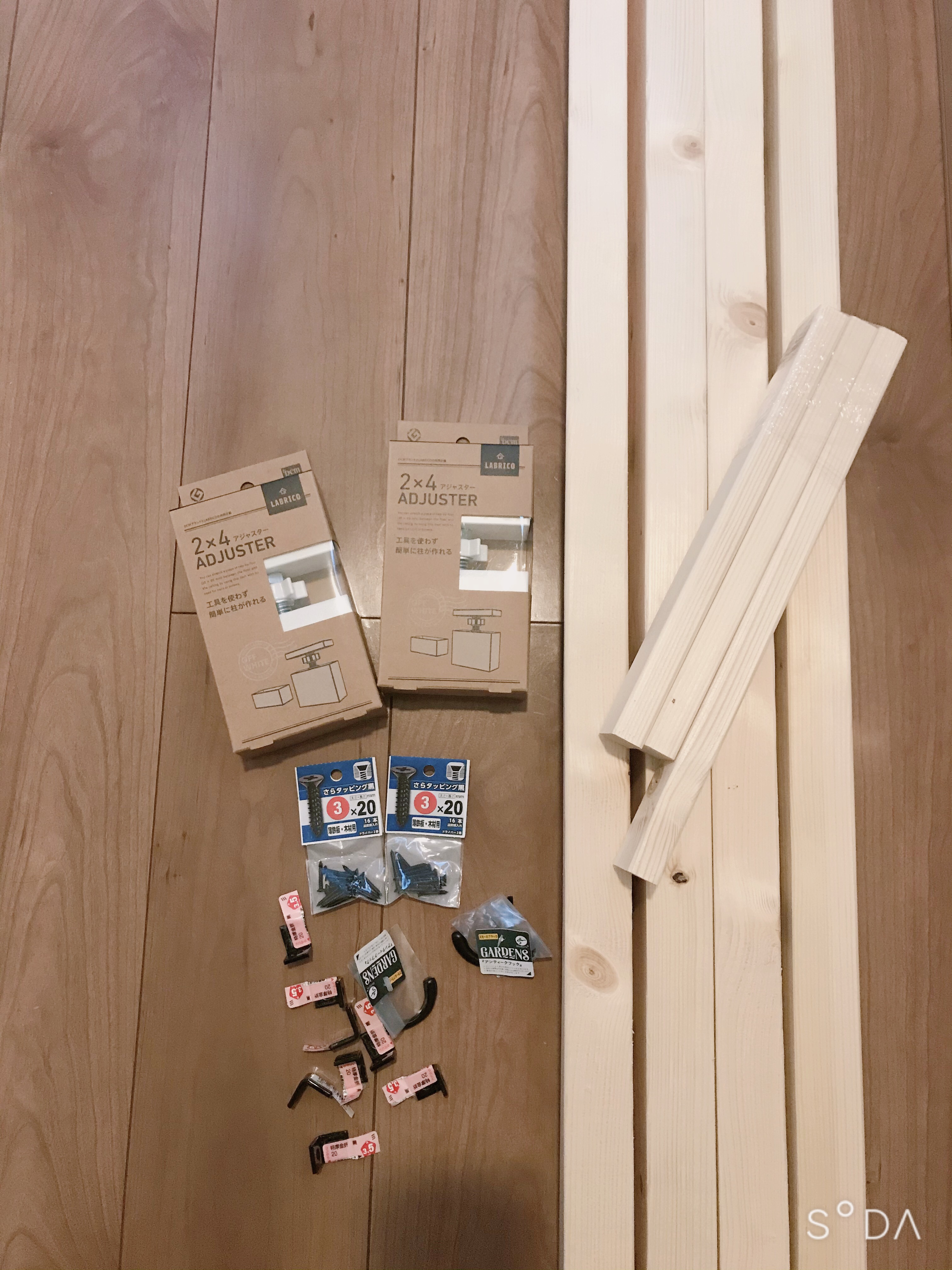 ホームセンターで2×4木材などをカットしてもらい、あとは適当にL字金具??とフックとラブリコのアジャスターさんをGET