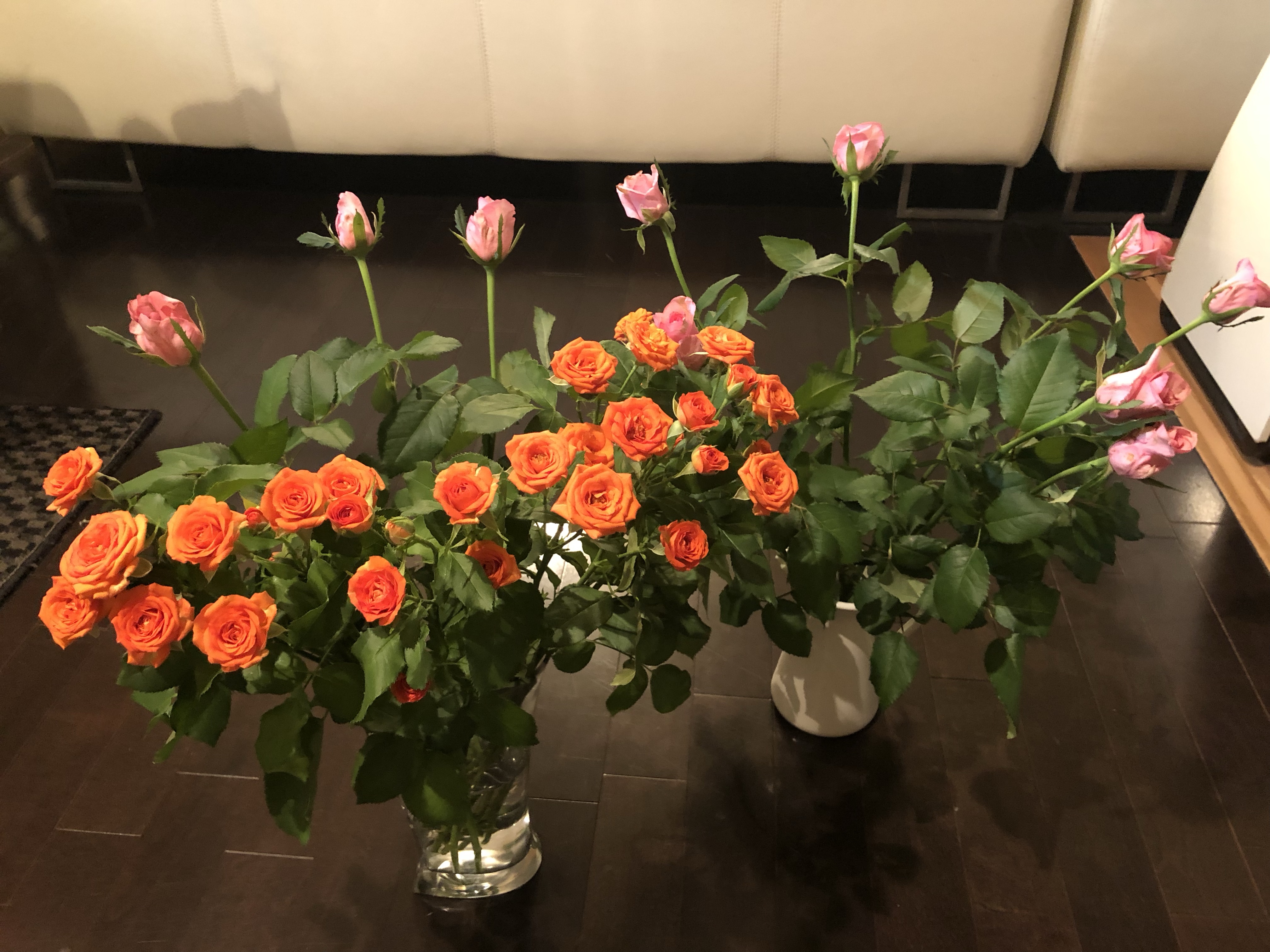 帰宅すると、とんでもない量の花束。収まらないので久しぶりの床ドン画像。