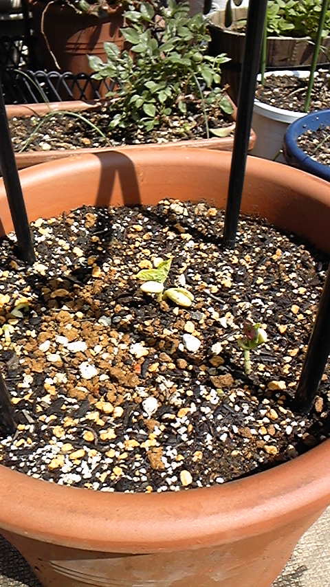 種の豆のサイズからすると、想像してた豆と違う種類を育てているかもしれません。ほっといて芽がでたじゃが芋もしゃれで植えたらどんどん成長しています。