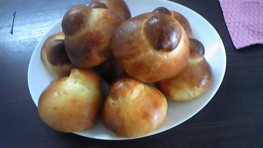 無事にできました☆ホンワカ出来立てを卵スープといただきました。少し甘く、バターたっぷり。なんでこの形なんでしょうね~
