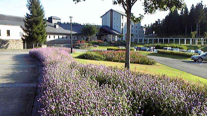 車道両側に『センニチコウ』という紫色の花の花壇がボリュームのある配置で