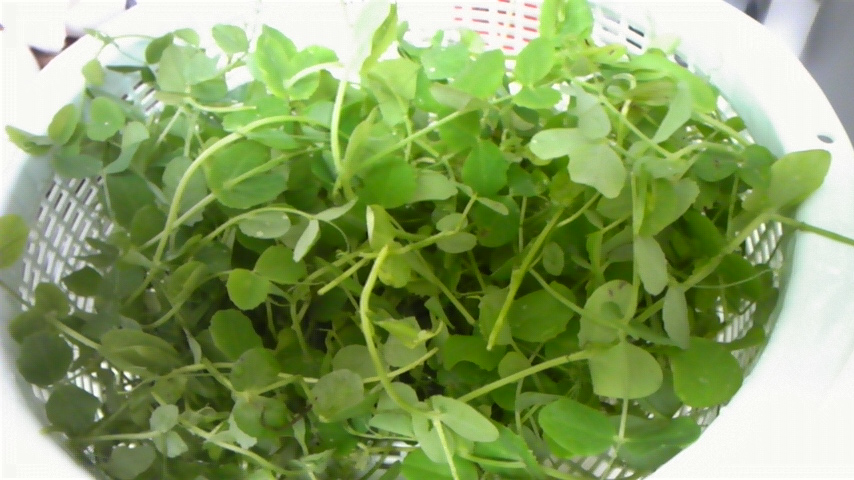 適当に水を張った細長いタッパーに入れ、おひさまのもと放置すると・・・わっさ~ともう一度収穫!(上部画像が二回目の収穫分。素晴らしいボリューム!)