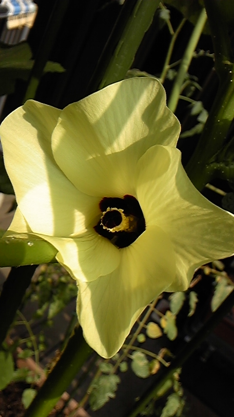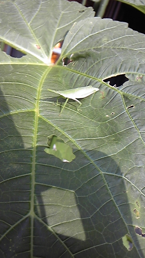 昨年に引き続き、生オクラを食べられると思うと嬉しい限り。そして葉の上にはバッタがむしゃむしゃと食事中。