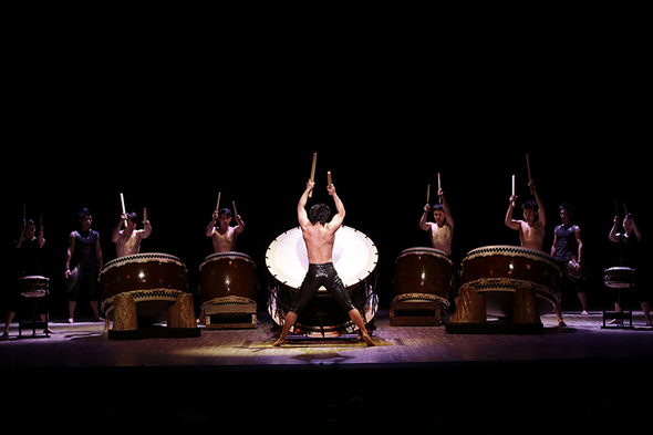 約2時間演奏のクライマックスは巨大な和太鼓4台を男性奏者たちが全身を使って叩く、