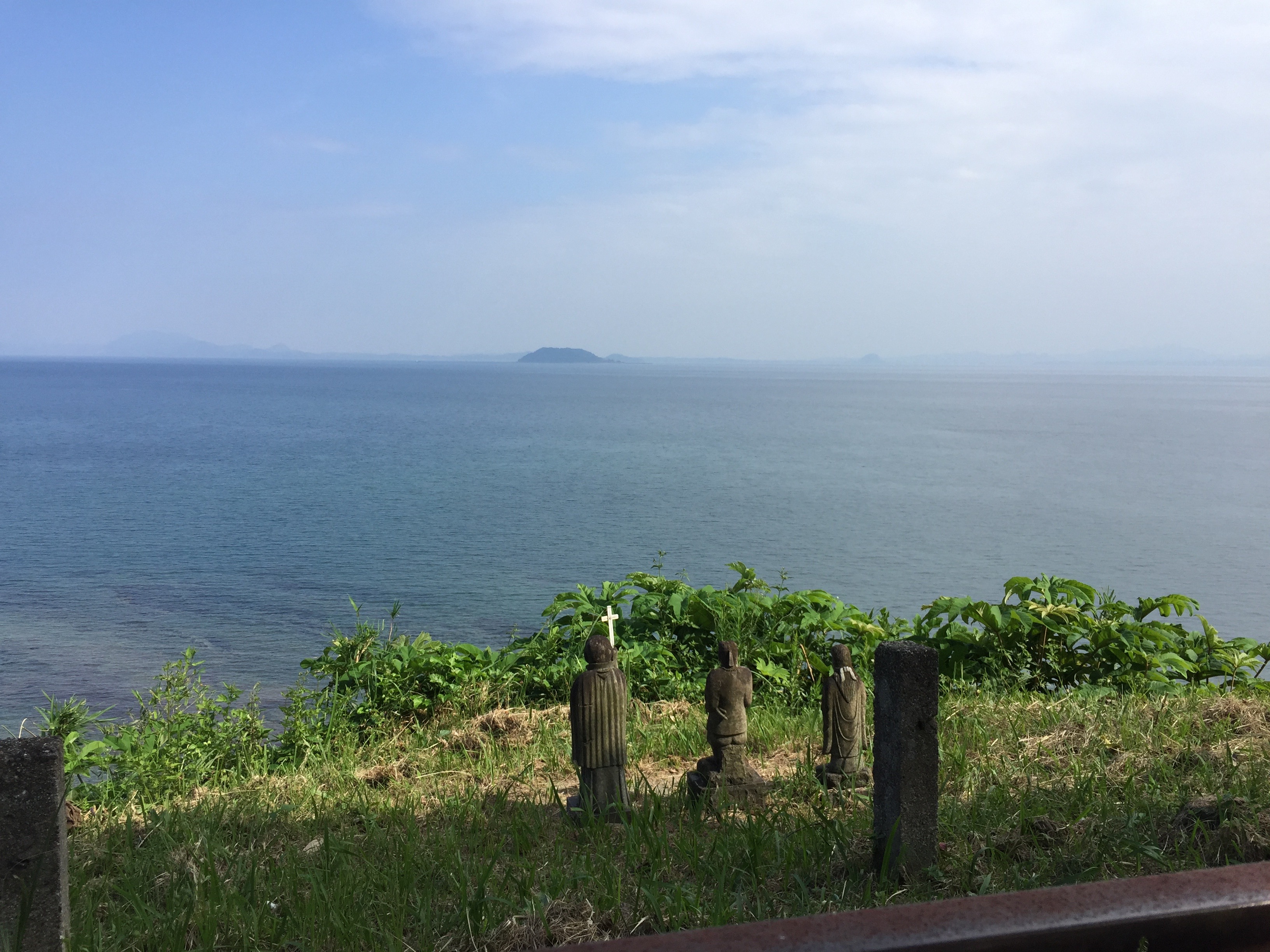 本丸のあたりに来ると大きな十字架と天草四郎時貞の銅像があり、また海に向かって祈りを捧げた3体のロザリオを掲げた小さな銅像がなんとも切なく感じられました。
