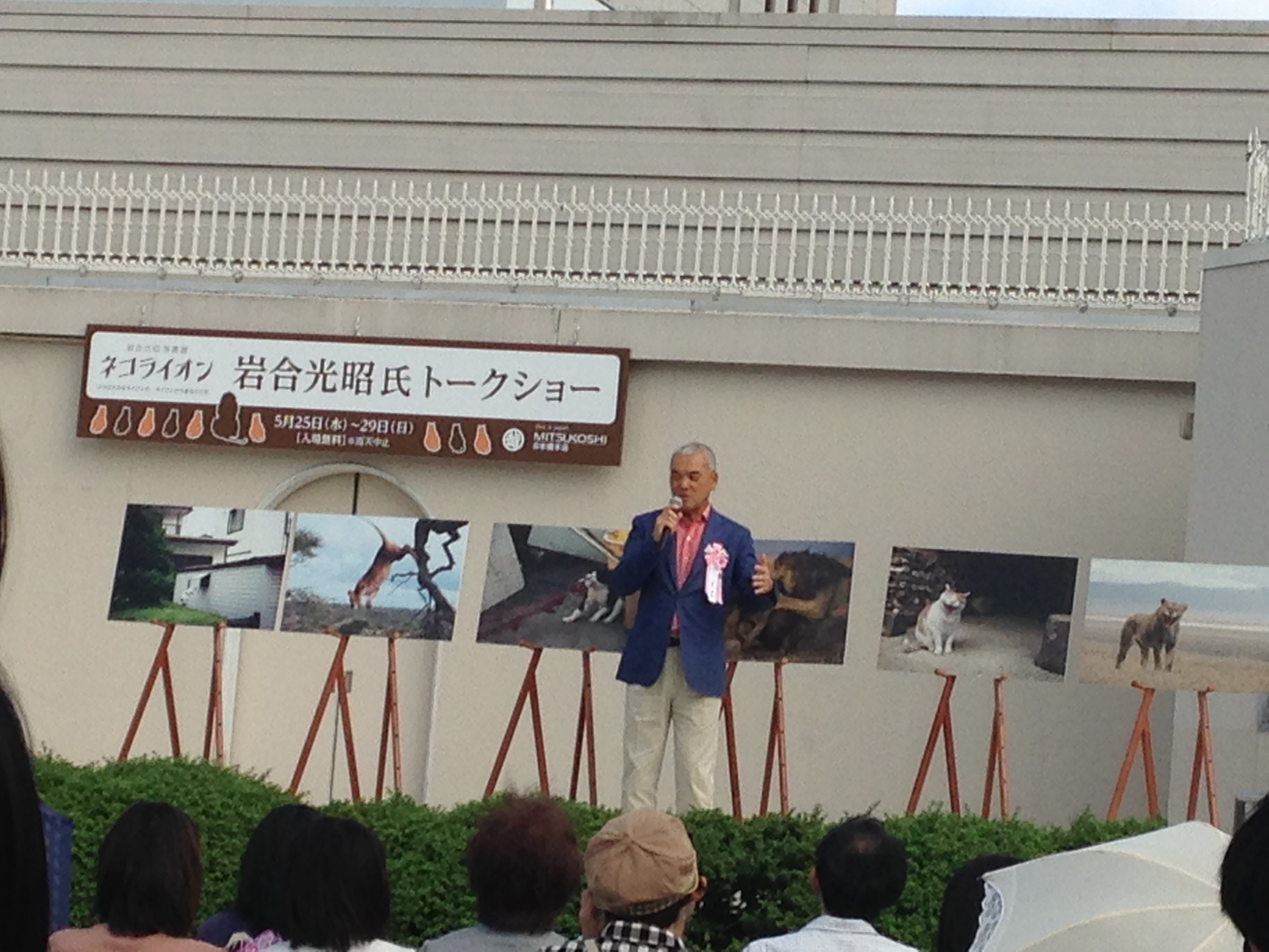 2016年05月28日 5/28 kawabata □ 岩合光昭氏のトークショー 日本橋三越で開催中の猫展に行ってきました。 イングリッシュガーデンの後に行ったら、たまたま岩合光昭さんのトークショーを聞くことができました! そのあと、ネコライオンの展示を見に行ったので、とても楽しめました。